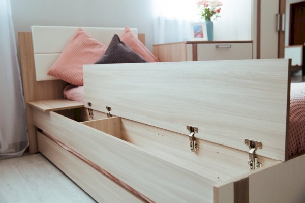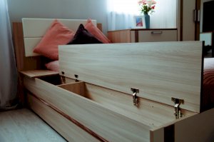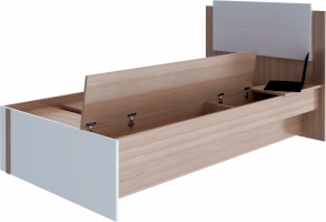 • Кровать оборудована столешницей, состоящей из стационарной части, которую можно использовать как мини-столик, и подъемной панели под которой скрыто место для хранения.