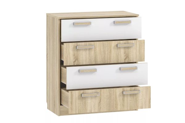 Комод «Фанк» - идеально подходит для обустройства комнаты подростка. Светлые тона мебели, выдержанный стиль прекрасно смотрятся в любом интерьере. Четыре удобных выдвижных ящика – это огромный объем для хранения белья, предметов одежды и аксессуаров. Выдвижные ящики оснащены шариковыми направляющими полного выдвижения, равномерно распределяют вес содержимого и обеспечивают плавный бесшумный ход ящика. Комод отлично сочетается с другими моделями коллекции «Фанк».