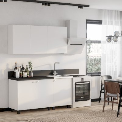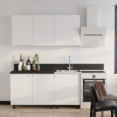 «Куба» - это компактная современная кухня с лаконичным дизайном. Контрастное сочетание белых фасадов и столешницы, декорированной под черный мрамор, сделает вашу кухню яркой и стильной. Прямые строгие линии данной модели, а также отсутствие лишних деталей позволят создать гармоничное и уютное пространство.