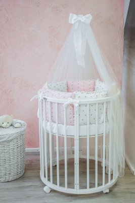 2. Овальная кроватка. Длину кроватки можно корректировать относительно роста ребенка. Это сделает покупку долговечной и избавит от необходимости покупать малышу новую кровать как минимум на пять лет вперед. Размеры овальной кроватки 78*128 см. Для овальной кроватки вы можете приобрести дополнительно овальный матрас