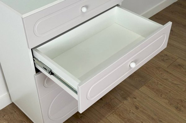 Корпус комода выполнен из ЛДСП толщиной 16 мм, фасады изготовлены из МДФ в плёнке ПВХ. Фасады с фрезеровкой подчёркивают аккуратный внешний вид изделия. Оригинальные круглые ручки и опоры придают комоду современный и лёгкий характер, делая его гармоничной частью детского интерьера.