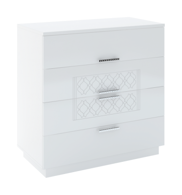 1. Белые глянцевые фасады МДФ с фрезеровкой «Орхидея», украшенные ручками с кристаллами.