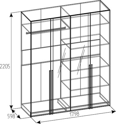 Четырехдверный шкаф для одежды и белья с зеркалами — находка для спальни любых габаритов. Продуманное внутреннее наполнение шкафа делает его поистине универсальным. Шкаф оснащен отделениями для хранения белья с регулируемыми по высоте полками и отделением для одежды со стационарной штангой.