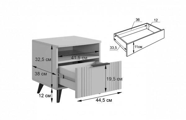 Тумба оснащена стильной ручкой и имеет удобное наполнение: выкатной ящик на шариковых направляющих и открытая ниша для хранения вещей. Это позволяет рационально использовать пространство и разместить различные предметы.