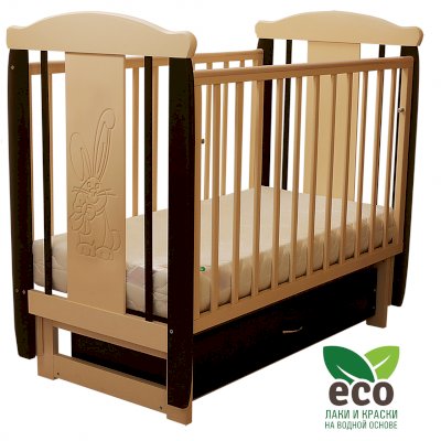 Кроватка декорирована фрезерным рисунком "Заяц с бантом". Уникальные фрезерные рисунки размером от 50 см на обеих спинках.
