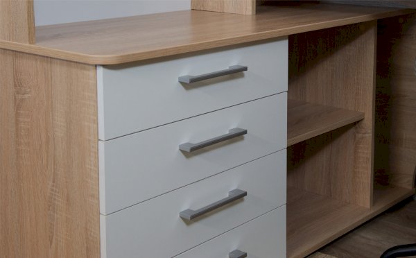 Стол письменный угловой – удобное рабочее место для студента, школьника, отличное решение для кабинета с интерьером в скандинавском стиле. На широкой столешнице легко поместится монитор, клавиатура и документы, на угловой части можно разместить оргтехнику. В столе выделено место для системного блока и для письменных принадлежностей. Его можно укомплектовать надставкой с множеством полок для папок, книг и декора. В столах системы Гарвард мягкие, удобные для опирающихся рук края, с кромкой в 2мм, а также, скруглённые углы столешницы. Корпус выполнен в теплом древесном цвете светлого дуба с приятной на ощупь фактурой, фасады - белые матовые. Нейтральные оттенки мебели позволяют легко вписаться уже в готовый интерьер.